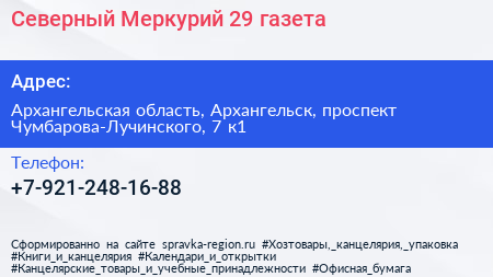 Северный Меркурий 29, газета по адресу Архангельская область, Архангельск, проспект Чумбарова-Лучинского, 7 к1 в дальнейшем Организация, размещена в следующих категориях: