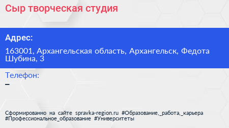 Сыр, творческая студия по адресу 163001, Архангельская область, Архангельск, Федота Шубина, 3 в дальнейшем Организация, размещена в следующих категориях:
