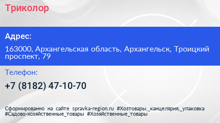 Триколор по адресу 163000, Архангельская область, Архангельск, Троицкий проспект, 79 в дальнейшем Организация, размещена в следующих категориях: