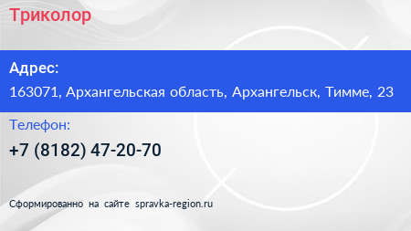 Триколор по адресу 163071, Архангельская область, Архангельск, Тимме, 23 в дальнейшем Организация, размещена в следующих категориях: