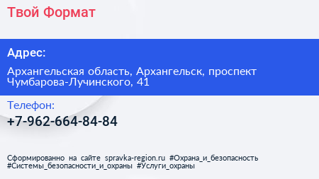Твой Формат по адресу Архангельская область, Архангельск, проспект Чумбарова-Лучинского, 41 в дальнейшем Организация, размещена в следующих категориях: