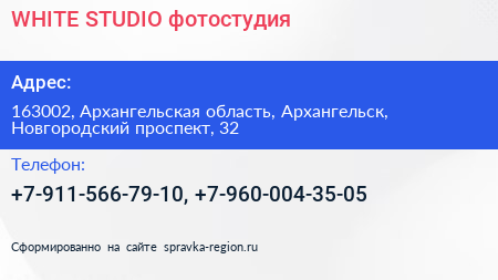 WHITE STUDIO, фотостудия по адресу 163002, Архангельская область, Архангельск, Новгородский проспект, 32 в дальнейшем Организация, размещена в следующих категориях: