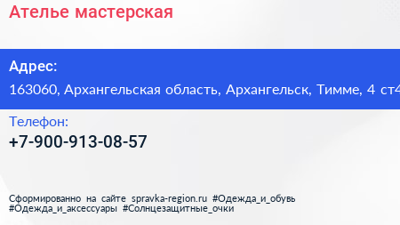 Ателье-мастерская по адресу 163060, Архангельская область, Архангельск, Тимме, 4 ст4 в дальнейшем Организация, размещена в следующих категориях: