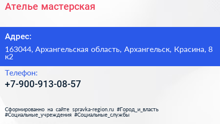 Ателье-мастерская по адресу 163044, Архангельская область, Архангельск, Красина, 8 к2 в дальнейшем Организация, размещена в следующих категориях:
