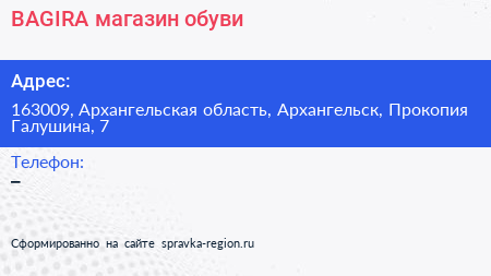 BAGIRA, магазин обуви по адресу 163009, Архангельская область, Архангельск, Прокопия Галушина, 7 в дальнейшем Организация, размещена в следующих категориях: