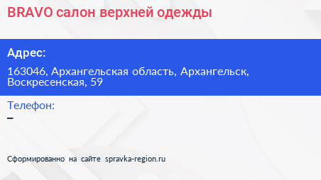 BRAVO, салон верхней одежды по адресу 163046, Архангельская область, Архангельск, Воскресенская, 59 в дальнейшем Организация, размещена в следующих категориях: