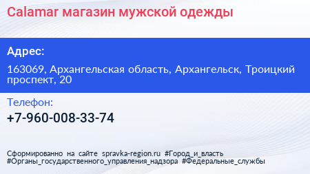 Calamar, магазин мужской одежды по адресу 163069, Архангельская область, Архангельск, Троицкий проспект, 20 в дальнейшем Организация, размещена в следующих категориях:
