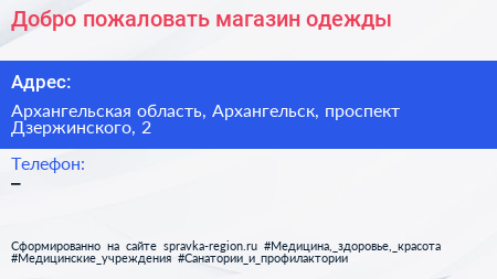 Добро пожаловать, магазин одежды по адресу Архангельская область, Архангельск, проспект Дзержинского, 2 в дальнейшем Организация, размещена в следующих категориях: