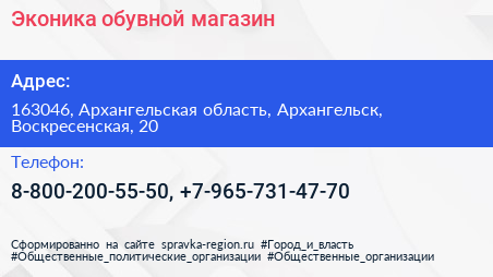 Эконика, обувной магазин по адресу 163046, Архангельская область, Архангельск, Воскресенская, 20 в дальнейшем Организация, размещена в следующих категориях: