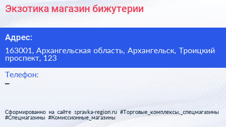 Экзотика, магазин бижутерии по адресу 163001, Архангельская область, Архангельск, Троицкий проспект, 123 в дальнейшем Организация, размещена в следующих категориях: