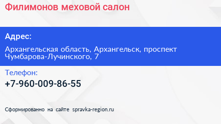 Филимонов, меховой салон по адресу Архангельская область, Архангельск, проспект Чумбарова-Лучинского, 7 в дальнейшем Организация, размещена в следующих категориях: