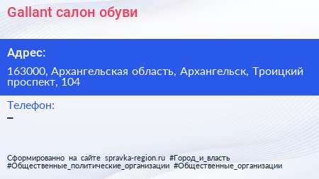 Gallant, салон обуви по адресу 163000, Архангельская область, Архангельск, Троицкий проспект, 104 в дальнейшем Организация, размещена в следующих категориях:
