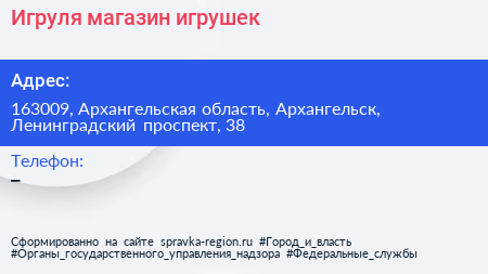 Игруля, магазин игрушек по адресу 163009, Архангельская область, Архангельск, Ленинградский проспект, 38 в дальнейшем Организация, размещена в следующих категориях: