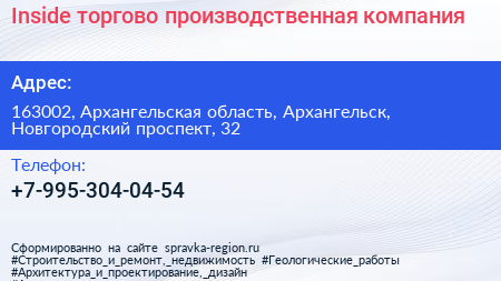 Inside, торгово-производственная компания по адресу 163002, Архангельская область, Архангельск, Новгородский проспект, 32 в дальнейшем Организация, размещена в следующих категориях: