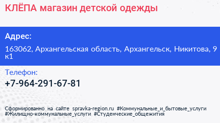 КЛЁПА, магазин детской одежды по адресу 163062, Архангельская область, Архангельск, Никитова, 9 к1 в дальнейшем Организация, размещена в следующих категориях: