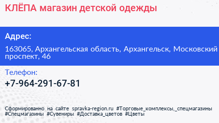 КЛЁПА, магазин детской одежды по адресу 163065, Архангельская область, Архангельск, Московский проспект, 46 в дальнейшем Организация, размещена в следующих категориях: