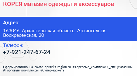 КОРЕЯ, магазин одежды и аксессуаров по адресу 163046, Архангельская область, Архангельск, Воскресенская, 20 в дальнейшем Организация, размещена в следующих категориях:
