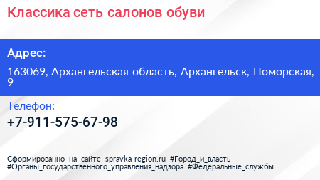 Классика, сеть салонов обуви по адресу 163069, Архангельская область, Архангельск, Поморская, 9 в дальнейшем Организация, размещена в следующих категориях: