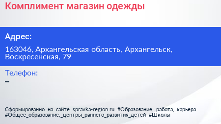 Комплимент, магазин одежды по адресу 163046, Архангельская область, Архангельск, Воскресенская, 79 в дальнейшем Организация, размещена в следующих категориях: