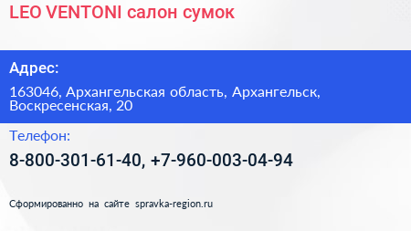 LEO VENTONI, салон сумок по адресу 163046, Архангельская область, Архангельск, Воскресенская, 20 в дальнейшем Организация, размещена в следующих категориях: