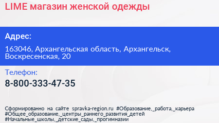 LIME, магазин женской одежды по адресу 163046, Архангельская область, Архангельск, Воскресенская, 20 в дальнейшем Организация, размещена в следующих категориях: