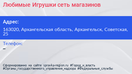 Любимые Игрушки, сеть магазинов по адресу 163020, Архангельская область, Архангельск, Советская, 25 в дальнейшем Организация, размещена в следующих категориях: