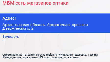 МБМ, сеть магазинов оптики по адресу Архангельская область, Архангельск, проспект Дзержинского, 2 в дальнейшем Организация, размещена в следующих категориях: