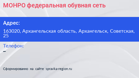 МОНРО, федеральная обувная сеть по адресу 163020, Архангельская область, Архангельск, Советская, 25 в дальнейшем Организация, размещена в следующих категориях: