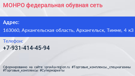 МОНРО, федеральная обувная сеть по адресу 163060, Архангельская область, Архангельск, Тимме, 4 к3 в дальнейшем Организация, размещена в следующих категориях: