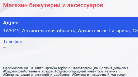 Магазин бижутерии и аксессуаров по адресу 163045, Архангельская область, Архангельск, Гагарина, 13 в дальнейшем Организация, размещена в следующих категориях: