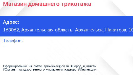 Магазин домашнего трикотажа по адресу 163062, Архангельская область, Архангельск, Никитова, 10 в дальнейшем Организация, размещена в следующих категориях: