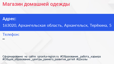 Магазин домашней одежды по адресу 163020, Архангельская область, Архангельск, Терёхина, 5 в дальнейшем Организация, размещена в следующих категориях: