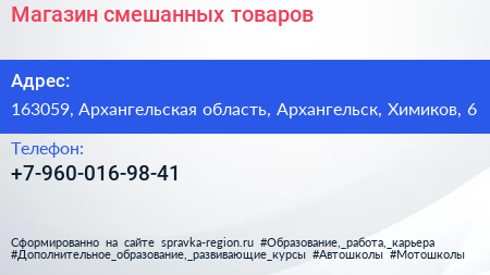 Магазин смешанных товаров по адресу 163059, Архангельская область, Архангельск, Химиков, 6 в дальнейшем Организация, размещена в следующих категориях: