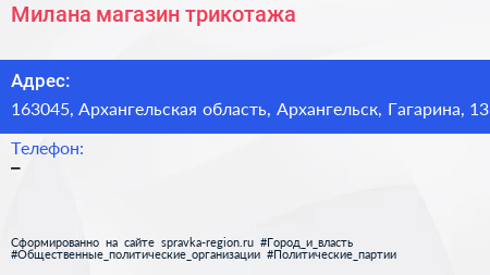 Милана, магазин трикотажа по адресу 163045, Архангельская область, Архангельск, Гагарина, 13 в дальнейшем Организация, размещена в следующих категориях: