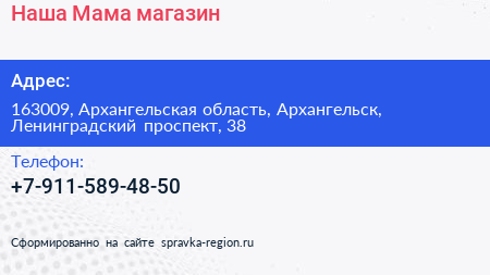 Наша Мама, магазин по адресу 163009, Архангельская область, Архангельск, Ленинградский проспект, 38 в дальнейшем Организация, размещена в следующих категориях: