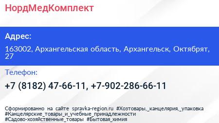НордМедКомплект по адресу 163002, Архангельская область, Архангельск, Октябрят, 27 в дальнейшем Организация, размещена в следующих категориях: