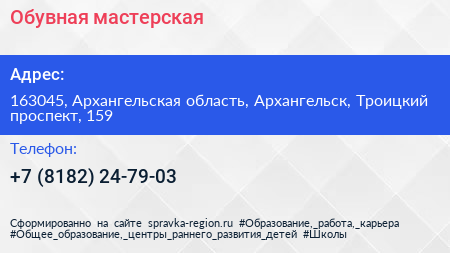 Обувная мастерская по адресу 163045, Архангельская область, Архангельск, Троицкий проспект, 159 в дальнейшем Организация, размещена в следующих категориях: