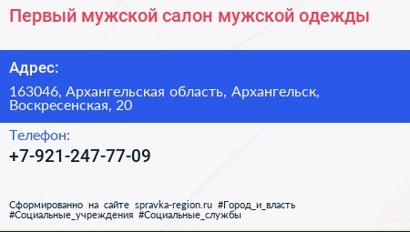 Первый мужской, салон мужской одежды по адресу 163046, Архангельская область, Архангельск, Воскресенская, 20 в дальнейшем Организация, размещена в следующих категориях: