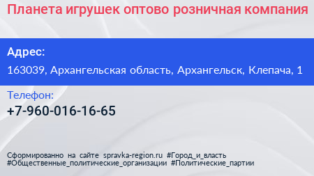 Планета игрушек, оптово-розничная компания по адресу 163039, Архангельская область, Архангельск, Клепача, 1 в дальнейшем Организация, размещена в следующих категориях: