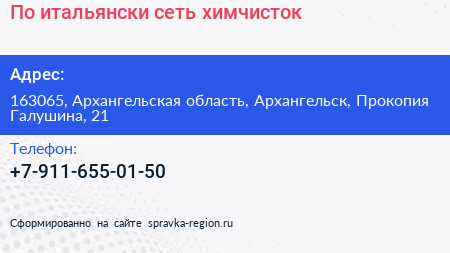 По-итальянски, сеть химчисток по адресу 163065, Архангельская область, Архангельск, Прокопия Галушина, 21 в дальнейшем Организация, размещена в следующих категориях: