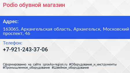 Podio, обувной магазин по адресу 163065, Архангельская область, Архангельск, Московский проспект, 46 в дальнейшем Организация, размещена в следующих категориях: