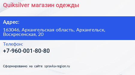Quiksilver, магазин одежды по адресу 163046, Архангельская область, Архангельск, Воскресенская, 20 в дальнейшем Организация, размещена в следующих категориях:
