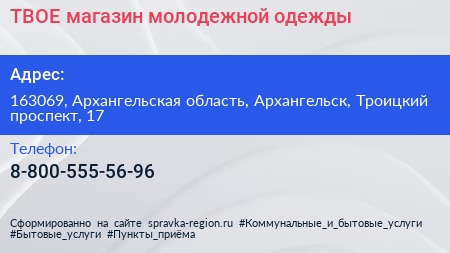 ТВОЕ, магазин молодежной одежды по адресу 163069, Архангельская область, Архангельск, Троицкий проспект, 17 в дальнейшем Организация, размещена в следующих категориях: