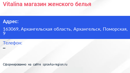 Vitalina, магазин женского белья по адресу 163069, Архангельская область, Архангельск, Поморская, 9 в дальнейшем Организация, размещена в следующих категориях: