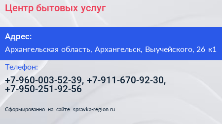 Центр бытовых услуг по адресу Архангельская область, Архангельск, Выучейского, 26 к1 в дальнейшем Организация, размещена в следующих категориях: