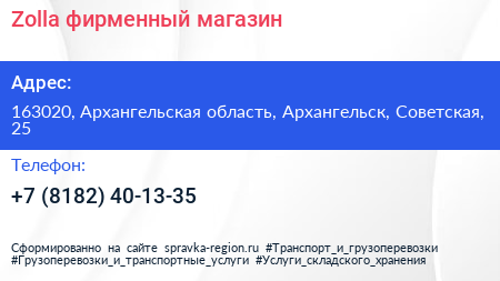 Zolla, фирменный магазин по адресу 163020, Архангельская область, Архангельск, Советская, 25 в дальнейшем Организация, размещена в следующих категориях: