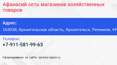 Афанасий, сеть магазинов хозяйственных товаров по адресу 163038, Архангельская область, Архангельск, Речников, 49 в дальнейшем Организация, размещена в следующих категориях: