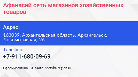 Афанасий, сеть магазинов хозяйственных товаров по адресу 163039, Архангельская область, Архангельск, Локомотивная, 26 в дальнейшем Организация, размещена в следующих категориях: