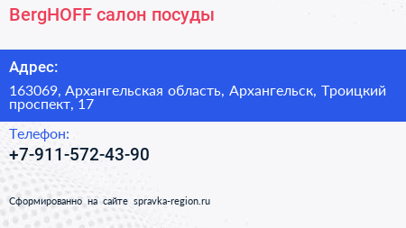 BergHOFF, салон посуды по адресу 163069, Архангельская область, Архангельск, Троицкий проспект, 17 в дальнейшем Организация, размещена в следующих категориях: