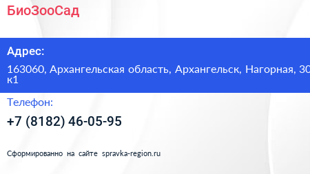 БиоЗооСад по адресу 163060, Архангельская область, Архангельск, Нагорная, 30 к1 в дальнейшем Организация, размещена в следующих категориях: